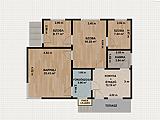 2 szoba, 2 félszoba, konyha + étkező, kádas fürdőszoba + mellékhelyiség, kamra, terasz.