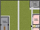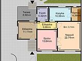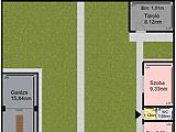 Nettó 77,3nm-es, 2szoba, előszoba, közlekedő, konyha, fürdőszoba + wc helyiségekből áll, illetve az előszobából nyílik egy 8,92nm-es TERASZ is. A ház alatt található egy kb. 10nm-es pince, ami a kamrából közelíthető meg, a padlásfeljáró is itt található. Tetőtere beépíthető, mivel beton födémes, a tető váza pedig vas szerkezetű, zsindely borítással.