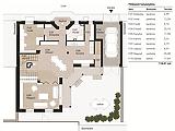 Az alsó szinten, amerikai konyhás nappali, fürdőszoba, előszoba és egy hálószoba van, míg a felső szinten, két hálószoba, közlekedő, 2 db fürdőszoba külön 2 db WC található, így összesen 3 hálószoba, 3 fürdőszoba, és 3 WC van. A nappaliból és az étkezőből közvetlen kapcsolta nyílik a 25 nm-es fedett teraszra.
