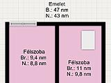 Az emeleten 1+2 félszobát, kádas fürdőszobát és gardróbot találunk. A tetőtérben pedig lehetőség nyílik egy újabb, bruttó 15 nm-es, nettó 10 nm-es szoba kialakítására.