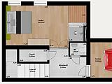 A felső szinten egy amerikai konyhás nappali, hatalmas faltól-falig érő ablakokkal, egy hálószoba és egy fürdőszoba került kialakításra. A nappaliból nyílik a 6nm-es erkély, mely üvegkorlátot kapott. Minden bútor, beleértve a gépesített konyhabútort is, egyedi tervek alapján készültek, kifejezetten ide.
