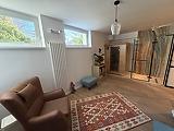 Az ingatlan fűtéséről egy Bosch kondenzációs kazán gondoskodik, a felső szinten padlófűtéssel, az alsó szinten pedig radiátoros fűtéssel. Szintén bekerült egy ultrahangos vízlágyító is. Mindkét szinten prémium minőségű burkolatok és szaniterek kerültek kiválasztásra és le-, illetve behelyezésre.