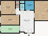 A szobákban laminált parketta ad egységes alapot, míg a vizes helyiségekben és a közlekedőben linóleum padló található. A falak minden helyiségben fűrészporos tapétával borítottak.