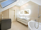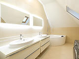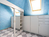 Az emeleti szinten 3 hálószoba, egy külön gardróbszoba, egy fürdőszoba, valamint egy külön WC kapott helyet. Az ingatlan összesen 7 szobával rendelkezik, így nagyobb család vagy többfunkciós használat esetén is kiváló választás.