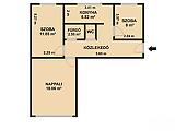 Nappali +2 félszoba, étkezős konyha, kamra, zuhanyzós fürdőszoba, wc, közlekedő, előszoba.