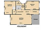 Nappali, konyha, étkező, közlekedő, wc, előszoba, 2 állásos garázs.