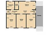 3 szoba, konyha + étkező, zuhanyzós fürdőszoba + mellékhelyiség, mellékhelyiség, kamra, közlekedő.