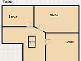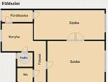 A földszinten található két szoba, konyha, fürdőszoba, külön WC, valamint padlásfeljáró. A helyiségek laminált padlóval és járólappal burkoltak.