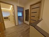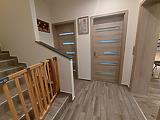 Az emeletre kényelmes lépcső vezet, ahol három hálószoba, közlekedő és egy második fürdőszoba kapott helyet.