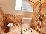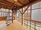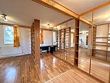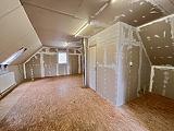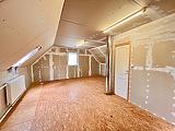 Jelenlegi elosztása a földszinten konyhából, kádas fürdőszobából és egy tágas térből áll, ahol egy térelválasztó könyvespolc és egy egyedi beépített tükrös gardróbszekrény található. A külön bejáratú emelet egy szobából és fürdőből áll, amely még befejezésre vár.