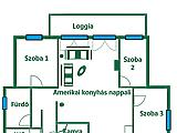 Az amerikai konyhás nappali mellett, előszobával, fürdőszobával külön WC-vel, és 3 hálószobával rendelkező lakás.