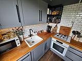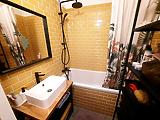 A fürdőszoba szintén felújított, esztétikus kialakítású, káddal ellátott. A fürdő és a WC külön helyiségben található, ami növeli a lakás komfortját. További előny a külön gardróbhelyiség, ahová a mosógép kiállás is átvezetésre került, így a lakótér még rendezettebb maradhat.