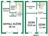 Belső két szinten, amerikai konyhás nappali saját kamrával, 2 db fürdőszoba és 2 db hálószoba van. A nagyobb szobából van kijárat a 9 nm-es nyugati fekvésű erkélyre.