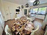 Az ingatlan szíve a lenyűgöző, tágas nappali–étkező–konyha tér, ahol a 2021-ben felújított, prémium Nobilia konyha a modern elegancia tökéletes példája. Innen, akárcsak a ház további helyiségeiből, közvetlen kijárat nyílik a teraszra, amely a jelenlegi 20 nm-ről akár 60 nm-re bővíthető – tökéletes helyszínt teremtve exkluzív vendéglátáshoz vagy meghitt családi pillanatokhoz.