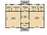 2 szoba, hall, konyha, 2 kamra, kádas fürdőszoba + WC, előszoba, 2 terasz.