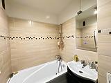 A fürdőszoba új burkolatot kapott és új akrilkáddal rendelkezik.